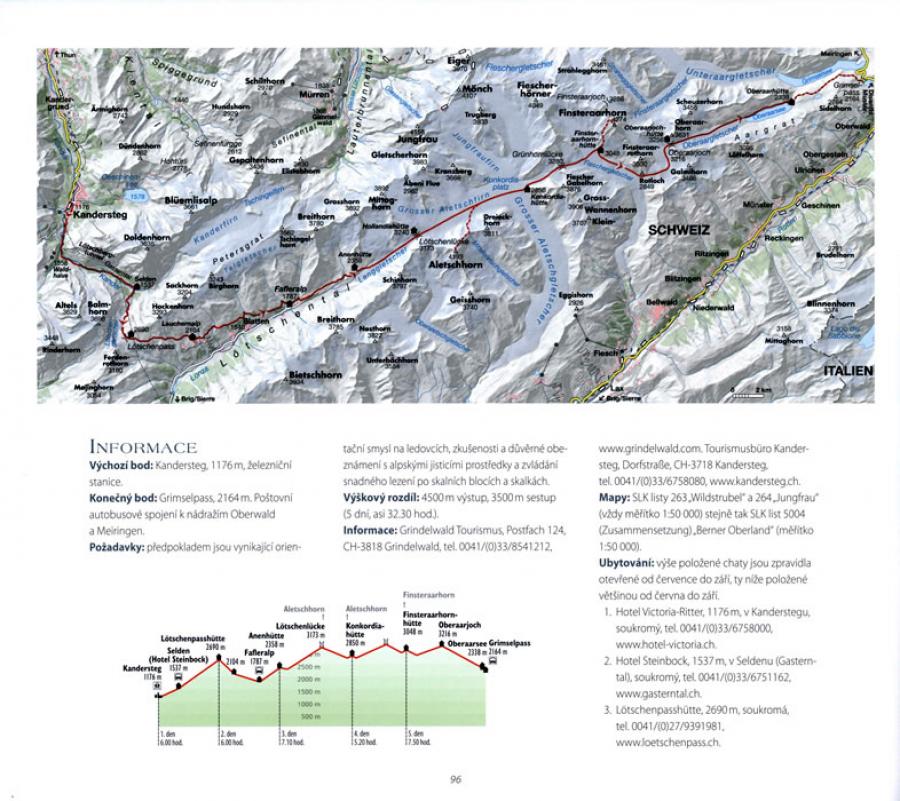 Autoři a fotografové představují v této nádherné obrazové publikaci 30 nejkrásnějších treků po tamních chatách. Jejich paleta sahá od snadných klasických tras, jako je Dolomitská vysokohorská značená cesta č. 1, až po obtížné vysokohorské túry, jako je přechod Bernské vysočiny. Velkolepé záběry doplňují autoři poutavými texty, přehlednými mapkami tras s výškovými profily a všemi podstatnými informacemi k uskutečnění túr.