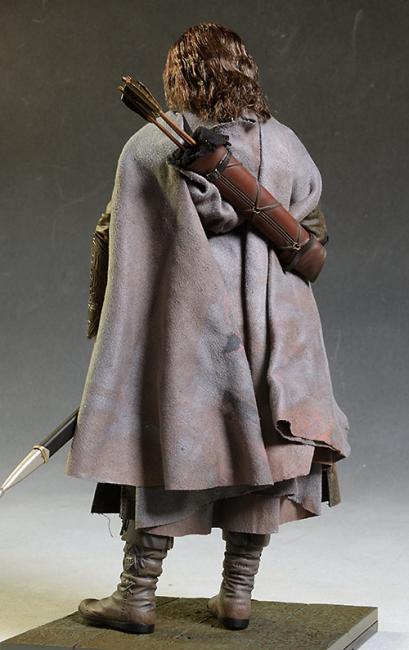 Next is the long leather jacket and bracers on the forearms. On his feet he has the sculpted boots, which should have been a little softer, to allow for some ankle articulation. Finally, he comes with the Elven cloak, complete with Elven leaf brooch at the throat.