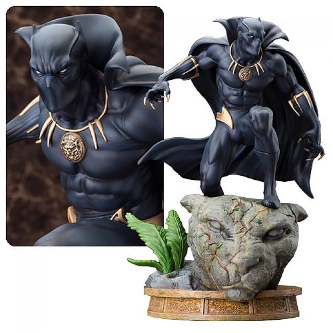 Marvel Black Panther Fine Art Statue: The latest elite Fine Art Statue in the Marvel Comics Presents Kotobukiya Collection adds a classic Avenger and royal hero with the mighty Black Panther! Lurking in the shadows and preparing to strike, Black Panther crouches on ancient ruins and keeps watch over his prey. The Avenger wears his iconic Wakandan vibranium costume, a sleek black bodysuit with integrated gloves, boots, and full mask plus a high collar and long cape. T Challa watches intently through the menacing white eyes of his costume, and the outfit is accented with golden claws, belt, necklace of office, and feline-inspired armbands. Displaying the grace and patience of his namesake, Black Panther is tense and ready to attack with muscles taught and claws spread. The Avenger is intricately detailed with piping and creases on his costume, the subtle expression on his face through his mask, and of course his glorious flowing cape. The Marvel Black Panther Fine Art Statue is made of resin and measures about 12-inches tall (1:6 scale) crouched atop a beautiful georama display base of an ancient panther statue overgrown with foliage. The most recent in a long line of chieftains of the Panther Clan, TChalla is the leader of the African nation of Wakanda, and his connection to the Panther God has given him enhanced abilities which he uses to defend his nation and the world alongside the Avengers as the Black Panther. TChalla is a brilliant scientist in addition to a superhero and has created many high-tech devices using the unique vibranium found in his home country. Now the feline-inspired hero has been immortalized in Fine Art Statue form, the definitive Black Panther collectible!
