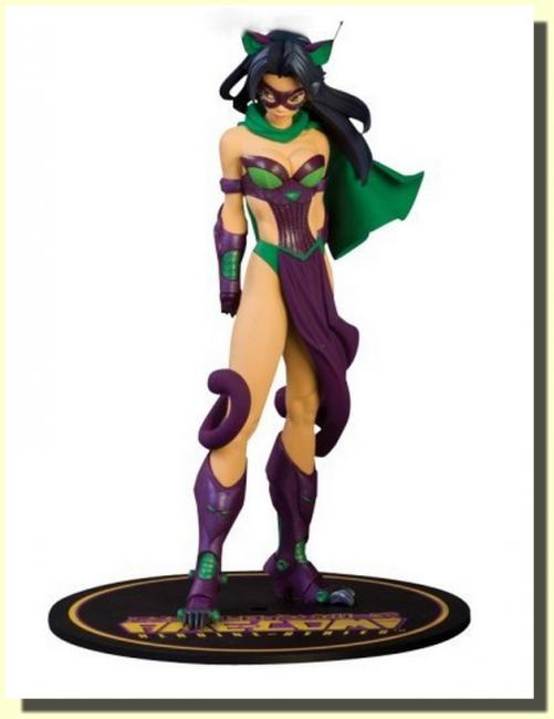 The new version of Gotham City s favorite feline is dressed in her iconic purple and green get-up. Catwoman (V. 2) gives a sly smile as her tail curls in anticipation of her next move. Packaged in a four-color box with J-hook, this limited-edition, non-articulated PVC statue measures approx. 23 cm.