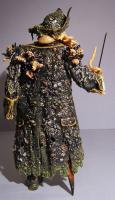 To be fair it is a fantastic sculpt by Pan Mak. Unlike any of the others in this line he is completely sculpted from the top most point of his tri-corner hat right down to the tip of his pointy crab leg. Because of the decision to make his attire out of rubber/silicone pretty much every element of this figure apart from his hessian sash is sculpted. This works fantastically for the look of the figure, and gives his outfit a kind of glossy, wet, translucence that adds to the authenticity of a cursed half fish man who lives most of his life beneath the waves. His coat and hat, well in fact pretty much all of him bar his face, crab leg and claw are adorned with all manner of fruits de la mer, like limpets, muscles, clams, cockles, barnacles, algae and seaweed, these are all sculpted to the usual HT standard- i.e. - very high, but more on his outfit later.