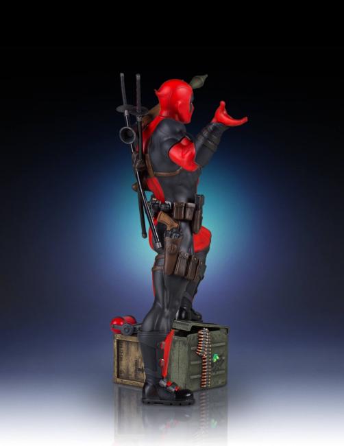 This 1:8 scale statue of Deadpool features his signature swords, a plethora of projectile weapons, and some questionable ones as well.