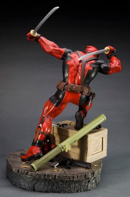 Depending on which style of fighting you prefer, Deadpool can be outfitted with either set of included arms; one wields his deadly katanas, the other fires intricately detailed Uzis! Deadpool stands approximately 10" H, leaning over a detailed battle scene complete with create and even a tiny Deadpool "plush" toy!