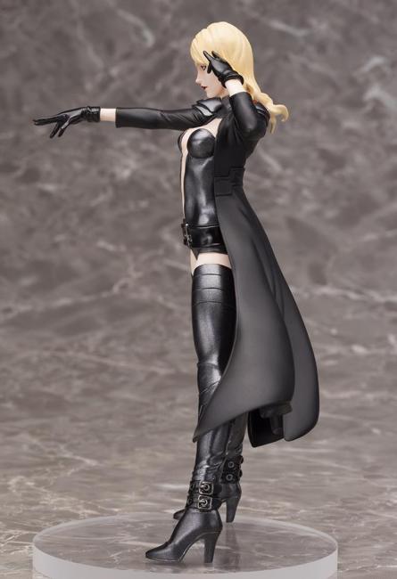 The dark black and metallic gray of her outfit contrast amazingly with her pale skin tone, blonde hair, and the bright color accents of the red "X" designs on her shoulders, blue eyes, and smoldering red lips.