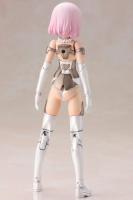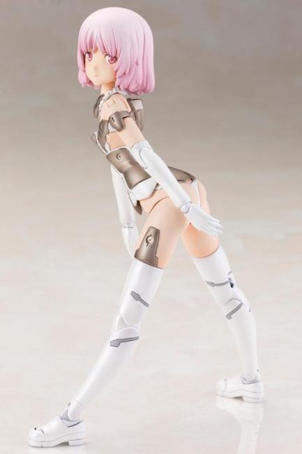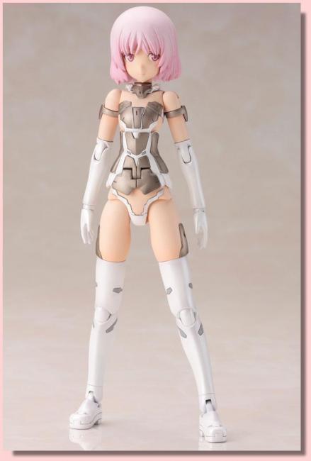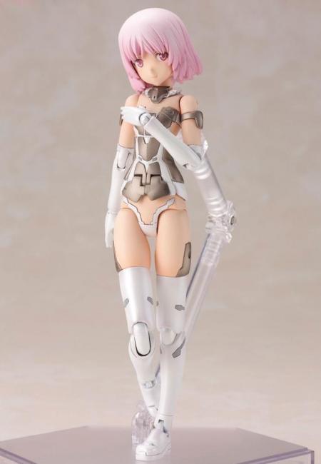 features all the fantastic features you have come to expect from the series of plastic model kits. This “White” version comes with pink hair and white and bronze armor and boots plus white underwear. She also comes with three interchangeable facial expressions: laughing face looking straight ahead, laughing face looking left, smiling face looking right; five pairs of interchangeable hands, decals and arm and thigh parts with 3mm connectors so you can use them with the MSG and regular Frame Arms series too.