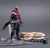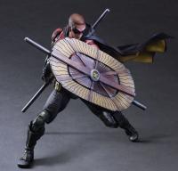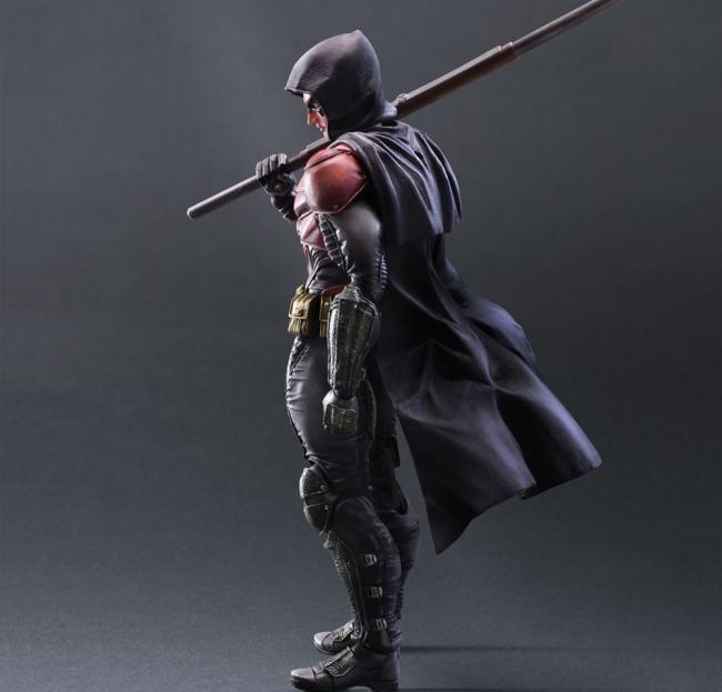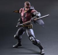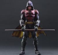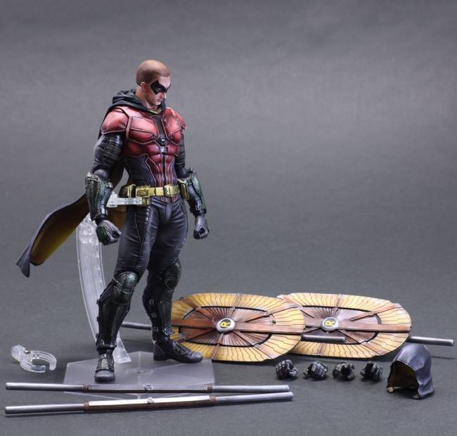 The Batman: Arkham Knight Robin Play Arts Kai Action Figure uses interchangeable accessory parts, with 2 variations of this figure: one with the hood over Robin s head, and one without. His bo staff comes in two variations as well - rod-shaped and shield-shaped, to allow for wide range of poseability.