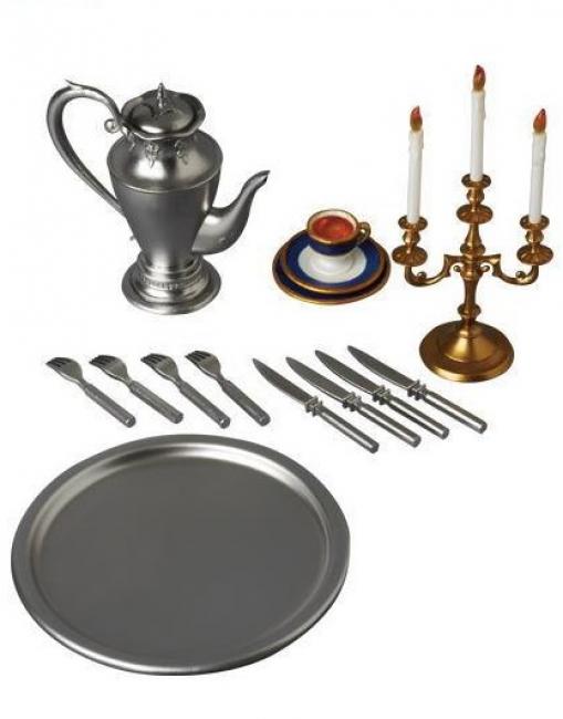 Included are three alternate expressions, two alternate hair parts, alternate hands, a candelabra, a tray (with teapot, cup, knife, and fork) his signature pocket watch, and an articulated stand!