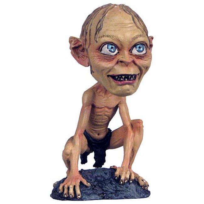 Talk about "deer in the headlights"! "We s look good on Master s desky, yes?" This hand-painted Lord of the Rings Smeagol Bobble Head lets you smack his head around for being so Gollum-ish, and watch as he bobbles with gleeful delight. Good Smeagol stands 6-inches tall and is made of heavy ceramic-type resin. He comes in a closed box, but you ll want to free him so he can continue his quest for the One Ring.
