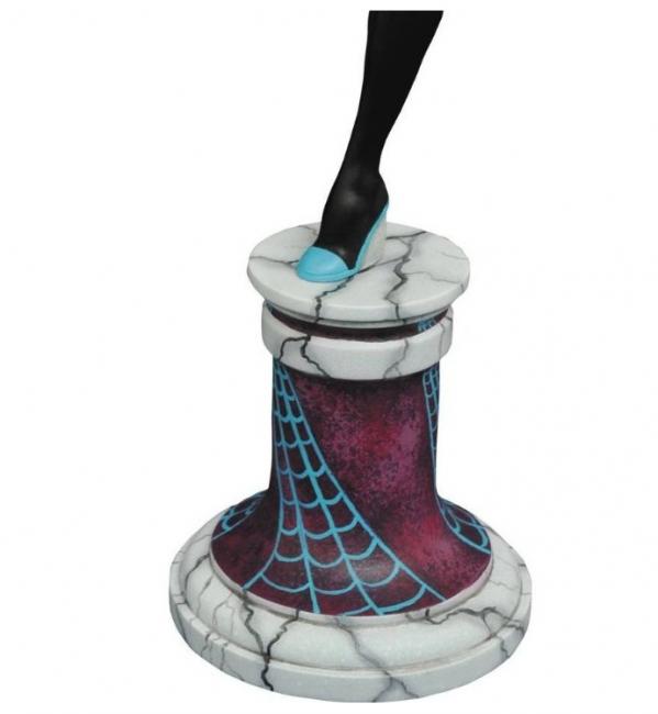 This 12-inch scale statue of the unmasked "Spider-Gwen" shows her alighting on a pillar, preparing to shoot a webline while balanced on one foot.