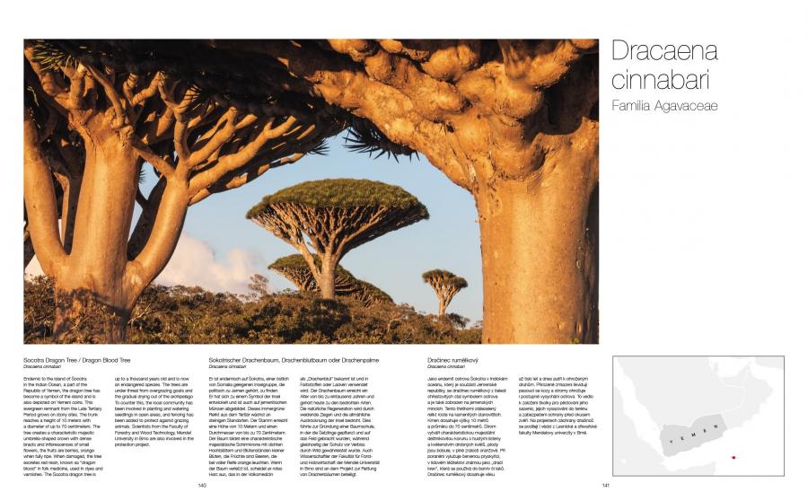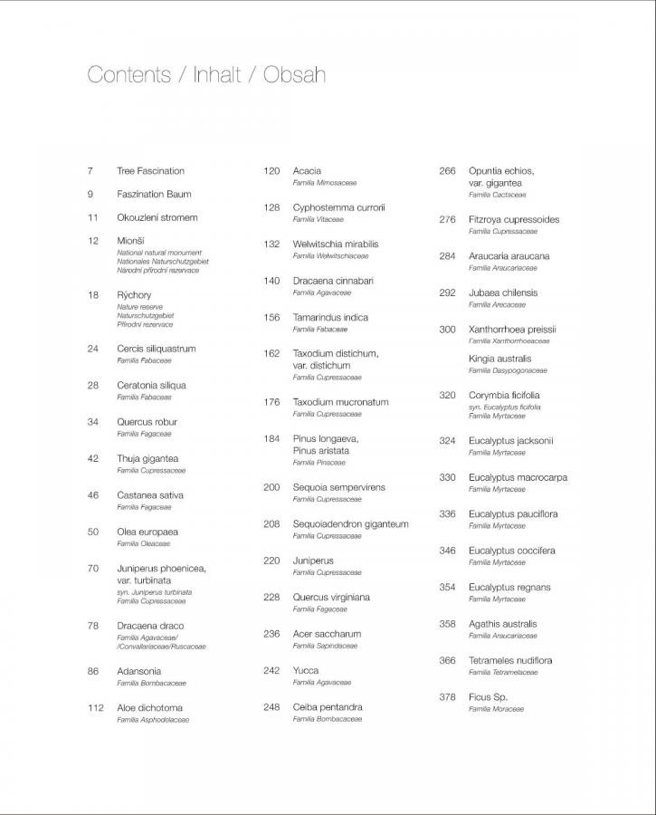Renomovaný fotograf Tomáš Míček, který nás již potěšil mnoha fotografickými publikacemi, představuje v této výpravné knize jednačtyřicet pozoruhodných druhů stromů, nejkrásnějších tisíciletých přírodních monumentů všech kontinentů planety Země. Kouzlo stromů zachycuje téměř mystickým způsobem. V tomto rozšířeném svazku s texty v češtině, němčině a angličtině přibylo třináct nových druhů stromů. Pohnutkou Míčkových často náročných expedic je bezpochyby estetické okouzlení, úžas nad rozmanitostí a výrazovou silou stromů, ať už se jedná o vzpurné zákruty řeckého olivovníku, o obří sekvojovce v Kalifornii, bizarní baobaby v Africe, nebo o australské žlutokapy. I když se autor občas zabývá také tématem lesa, zaměřuje se převážně na jednotlivé stromy. Přitom mu nejde jenom o zakotvenost v přírodě, ale i o jejich vzdorovitý boj o přežití v často nehostinném prostředí. Na mnoha místech se fotograf věnuje okouzlujícím detailům, jako jsou struktura kůry a mnohovrstevná spleť kořenů. Vznikají tak téměř abstraktní obrazy, které nám odhalují „tkáň“ přírody.