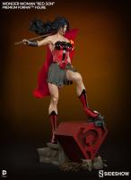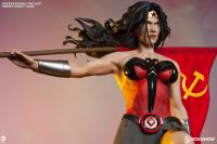 Re-issue of the 2014 DC Comics: Justice League Wonder Woman Premium Format Figure, mixed-media Modern Age Wonder Woman statue fabricated with hand-painted polystone, gray fabric pteruges style skirt with black beveled star appliques at the end of each strip, full-color eye decals and imprinted details, featuring a variant sculpt and paint application based on her appearance in Elseworlds – Superman: Red Son three-issue graphic novel series (2003) written by Mark Millar with art by Dave Johnson where she acts as one of Superman s allies as a Soviet “Peace Ambassador”, standing atop a sculpted hammer and sickle shield base accented with gold painted vines and leaves.