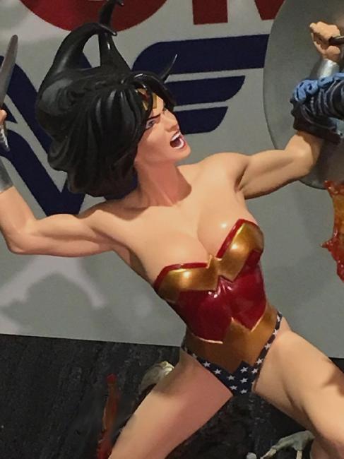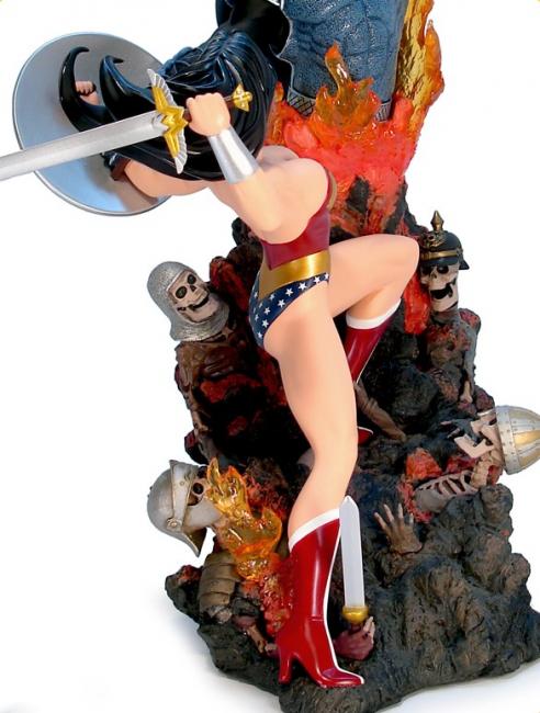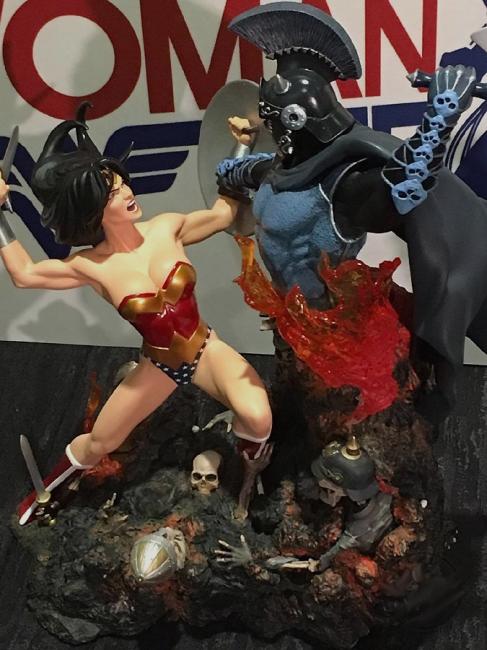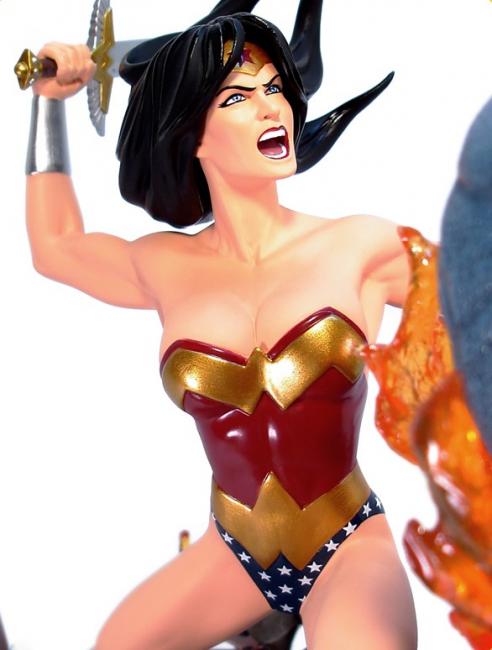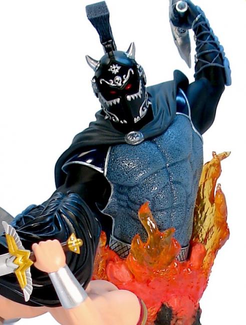 The third in the DC Comics: Classic Confrontations line, this hand-painted cold-cast porcelain statue with full-color eye decals, white star decals and clear tinted-resin accents features a Modern Age Wonder Woman and Ares, the God of War, frozen in battle.