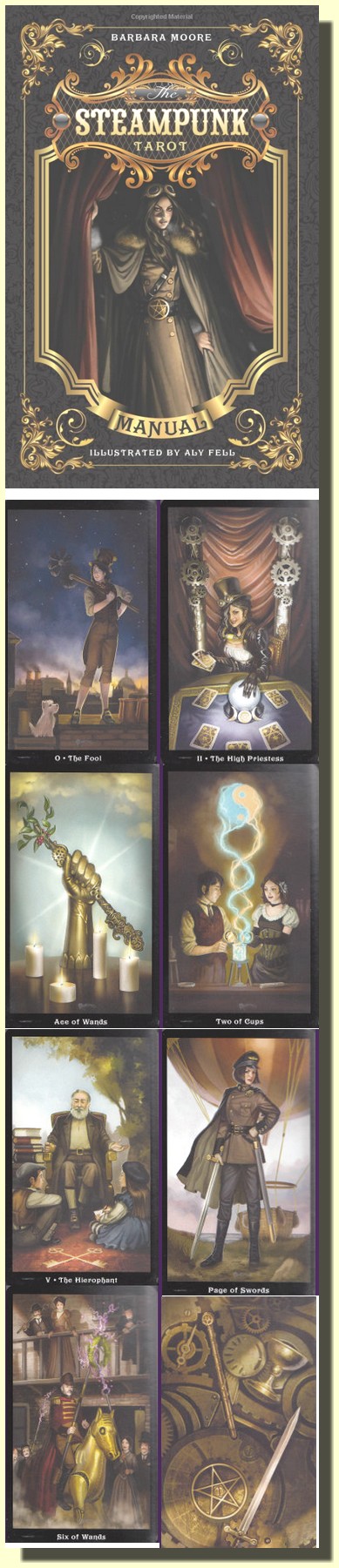 Nasaďte si letecké či svářečské brýle, oblečte si svůj nejlepší korzet, posaďte si na hlavu cylindr a vydejte se na dobrodružnou výpravu do světa steampunku. Steampunk si pohrává s myšlenkou, jak by se mohla odehrát historie, kdyby se některé věci staly jinak. Tím se silně podobá většině tarotových výkladů, v jejichž posvátném světě si také můžeme představovat, co by se stalo, kdyby...Svět steampunku vám nabízí fantastické prostředí, do něhož můžete zasadit své příběhy, a tarotové karty vám je pomohou vyprávět. Při tom všem se zároveň seznámíte s pozoruhodným fenoménem jménem steampunk. Autorka Barbara Moore vám představí postavy tarotu oblečené ve stylu steampunku a tak poznáte i hlavní prvky stampunkové mody.