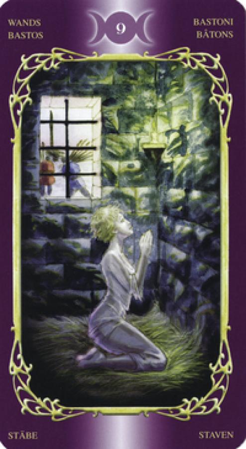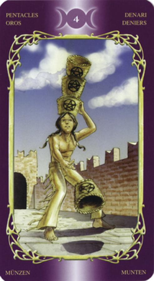 Unlike most religious paths, Wicca sees all aspects of life, including sexuality, as divine. This deck is primarily an international Pagan Tarot: The Hanged Man shows a Native American hanging from a tree limb. The Stars shows an African in loose pantaloons, his arms outstretched. The Moon shows a statue of Anubis in front of pyramids. The 4 of Cups shows a mournful young Asian woman with three spilled cups and one cup upright.