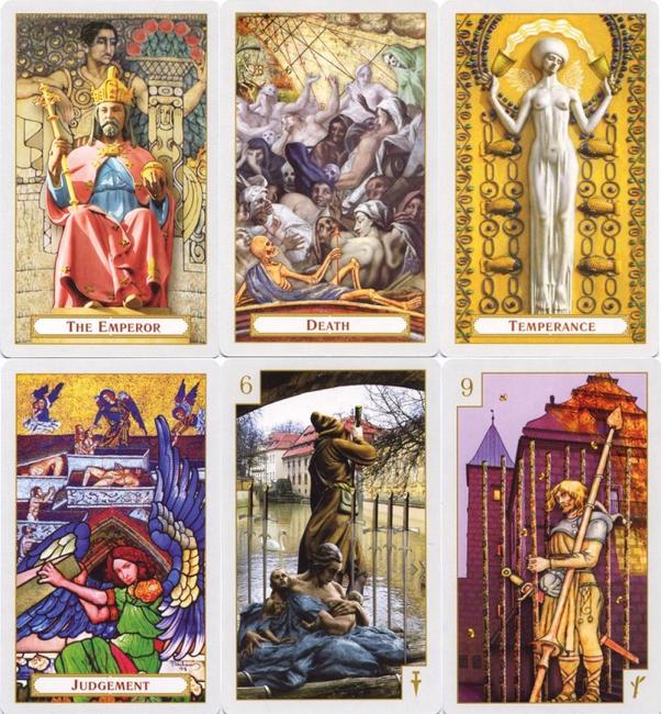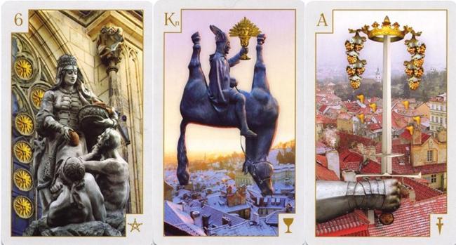 “The Tarot of Prague was designed to be a vibrant expression of the city. The images are collaged from thousands of original photographs of the streets and houses, the murals and statues, manuscripts and drawings, and even from the games that make up Pragues rich visual treasury.”