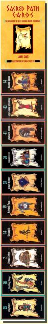 The Sacred Path Cards is an oracle deck based on Native American spirituality. Each high-contrast card presents a painting on a tanned hide of varying hue, set upon a black background. Cards are titled and also have an explanatory keyword.