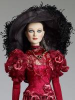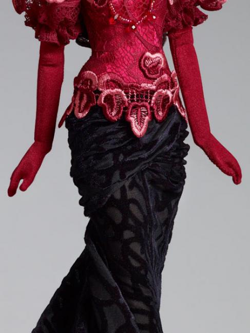 From the Re-Imagination Collection comes My Wonderland, a reinterpretation of the iconic tale, Alice in Wonderland. Everyone knows that Haddy Madigan is Mad About Tea. She is also mad about hats and her striking ensemble for her next tea party sets the tone. Her painted blue eyes stand out against her lavishly large black taffeta hat which boasts a scene stealing fringe trim. The red lace detail of her dress bodice looks stunning with her black velvet burnout skirt. Her red gloves, beaded necklaces, and black faux leather shoes are the accessories that complete her avant-garde look.