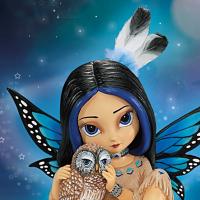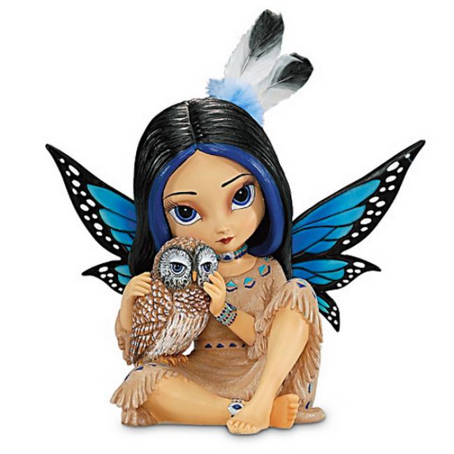 This first-ever Native American-inspired fairy from Jasmine is just waiting to call upon the spirit of wisdom to show you the way. Handcrafted by skilled artisans, she perfectly captures Jasmine s distinctive wide-eyed style. Her colorful wings, the sculptured fringe and beadwork on her clothes, and even the intricate details of her owl friend add rich texture. As a finishing touch, she even wears real hand-applied feathers.