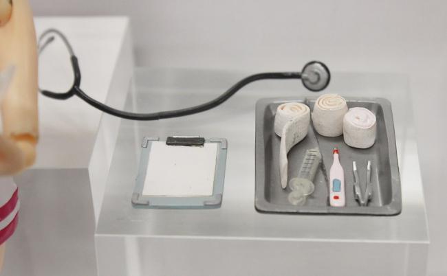 syringe (large), syringe (small), stethoscope, thermometer, tweezers, 3 x bandages, medical trays, medical record,