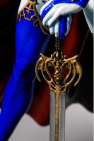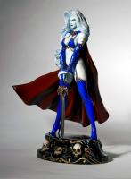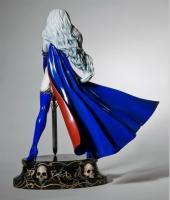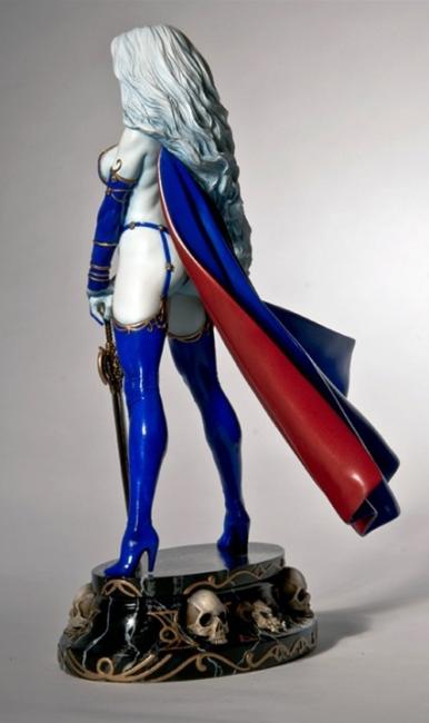 Sensuous and regal in her royal blue, gold filigreed glory, Lady Death nobly stands, sword in hand, scarlet cape flowing.