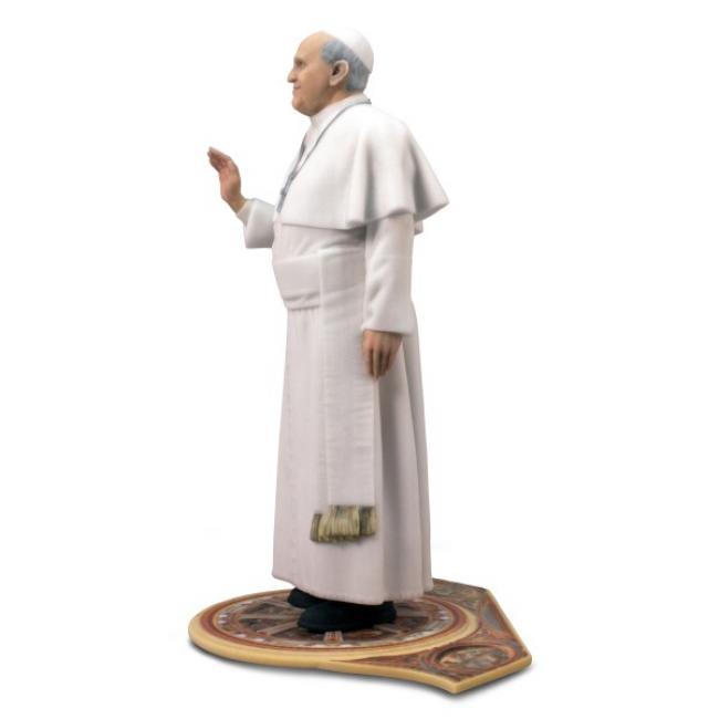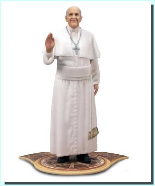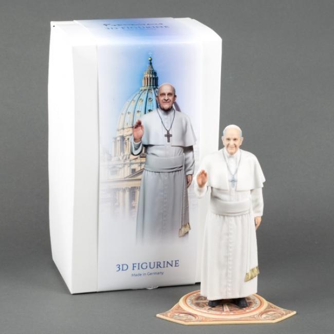 Pope Francis 3D Printed Figurine cca 18 cm /7". This photorealistic 3D printed figurine of Pope Francis is presented in commemoration of the 2015 Papal Visit USA. This full-color sandstone figurine stands on a color printed baseplate with an image detail of dome of St. Peter s Basilica. Pope Francis is in ordinary dress including a white cassock, pellegrina, fascia, pectoral cross and a white zucchetto on his head.