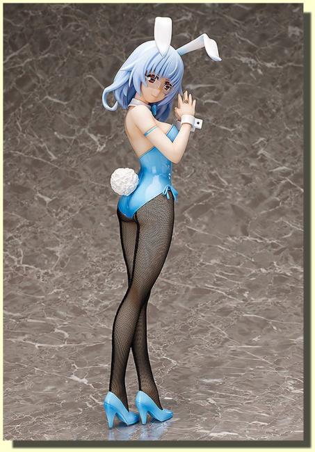 The brilliant bright blue bunny outfit gives her a charming appearance, while the slight blush on her cheeks and embarrassed expression show off her personality for fans to enjoy.