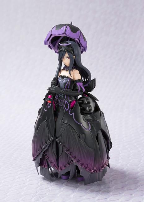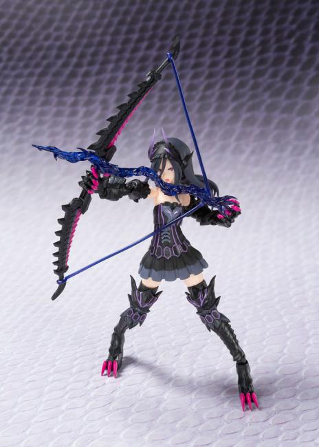 The 140 mm tall figure also comes with a bow and arrow, parasol, four swappable facial expressions, optional hair bangs, swappable arms and legs, transforming skirt parts, and a stand.