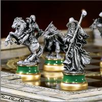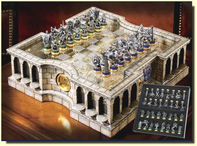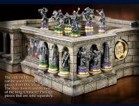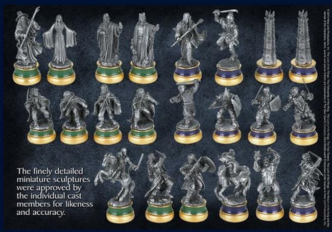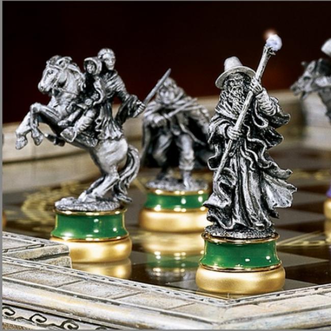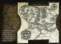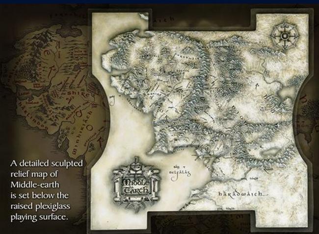 The board is a magnificent work of art, detailing the story of Frodo, the reluctant hero of The Shire, and the friends and foes he encounters throughout his amazing journey. An ancient map of Middle-earth is mounted below the playing surface, and the base features actual images of the memorable characters and scenes from the thrilling New Line Cinema motion picture.