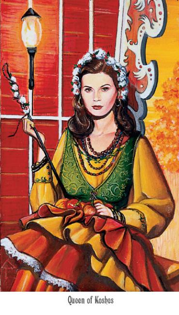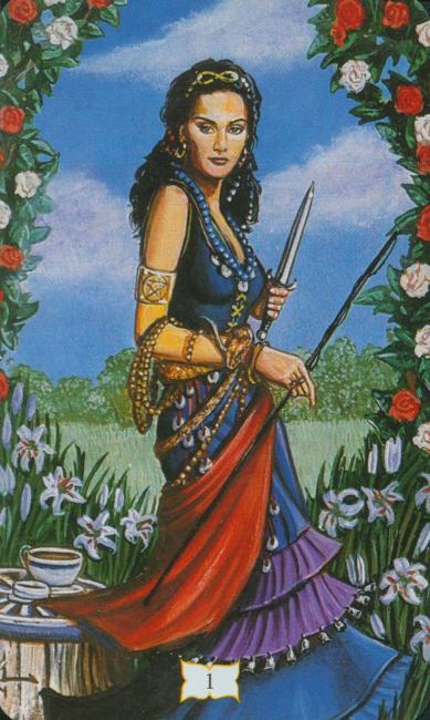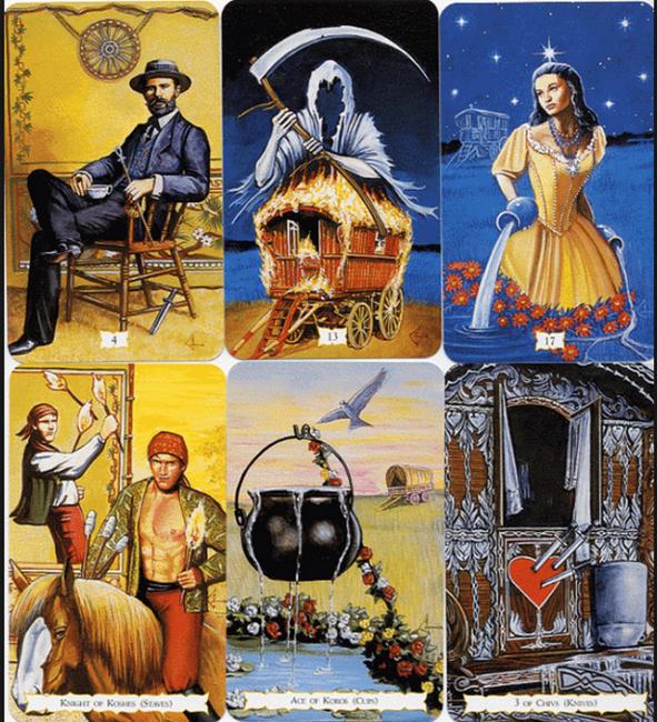 The Buckland Romani Tarot is based around English gypsies and has expressive and beautiful artwork. The cards are borderless, and give the feeling that you could step into the picture. It is not a standard Rider-Waite type deck; among other things, suits have been renamed to Koshes, Koros, Bolers and Chivs, (Staves, Cups, Wheels and Knives), and the Magician is shown as a woman.