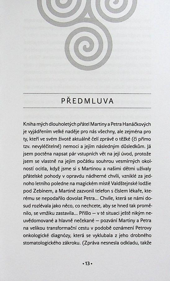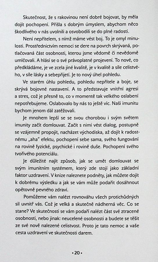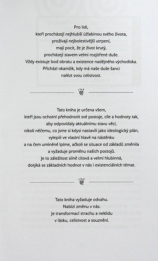 Všechno, co se nám děje, je láska, i když to tak na první pohled někdy nevypadá. V našem případě bylo darem transformace onemocnění rakovinou. Tato kniha byla napsána na základě osobní zkušenosti, úspěšně zvládnuté velmi těžké nemoci. Je určena lidem, kteří procházejí těžkým obdobím svého života. Má jim být pomocí a oporou v tom, aby nezůstali zakotveni ve schématu mentality oběti. Jejím cílem je dát naději a podpořit v tom, aby do procesu uzdravování aktivně zapojili svoje vnitřní sily, zbavili se negací všeho druhu a osvobodili z dramatu, které je kolem každého závažného onemocnění velmi hutně obaleno. Víme, že kvantová medicína a uzdravení skrze uvolnění vnitřních procesů v nás je zatím cesta nová. Do budoucna ji ale bude následovat stále více lidí. Vysvětlujeme, proč je postoj lásky, odpuštění a propuštění starých programů v nás tak účinný. Někdy je transformace nejen osobní, ale je to způsob zásadní proměny celého rodového fraktálu.