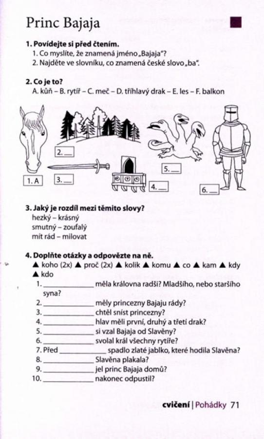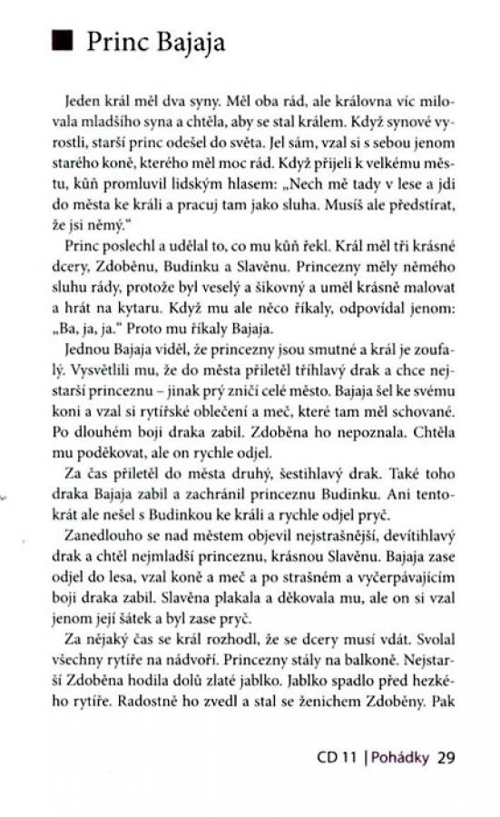 Další publikace z edice Adaptovaná česká próza, určené studentům češtiny jako cizího jazyka, přináší tradiční pohádky české i zahraniční provenience. Kratší pohádky O veliké řepě, O kohoutkovi a slepičce, Tři prasátka, O perníkové chaloupce a Červená Karkulka, i klasické příběhy, jako jsou Popelka, Sněhurka, Šípková Růženka, O dvanácti měsíčkách nebo Princ Bajaja, představují vhodnou, nenáročnou četbu nejen pro děti, ale i pro dospělé studenty češtiny. Každou z dvanácti pohádek doprovázejí názorné ilustrace, které přibližují děj a podstatně napomáhají procvičení a osvojení slovní zásoby. Publikace obsahuje soubor gramaticko-lexikálních cvičení ke každému textu, česko-anglicko-německo-ruský slovníček a klíč ke cvičením. Součástí svazku je i audio CD s kompletní nahrávkou textů. Kniha je určena studentům češtiny jako cizího jazyka na úrovni A2.