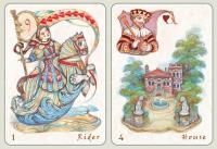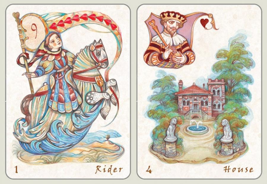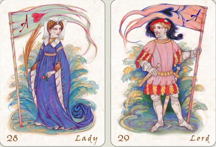The playing card references appear as flags or court card image inserts. The card s number and name are also provided, in English. The additional Lord and Lady cards allow the reader to make a wider and more inclusive range of relationship pairings.