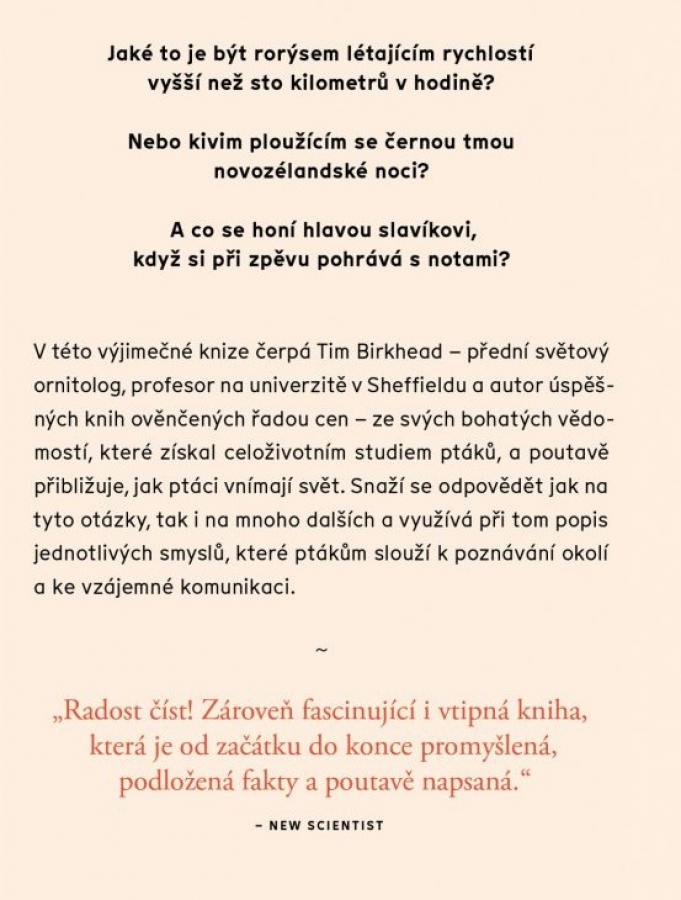 V této výjimečné knize čerpá Tim Birkhead - přední světový ornitolog, profesor na univerzitě v Sheffieldu a autor úspěšných knih ověnčených řadou cen - ze svých bohatých vědomostí, které získal celoživotním studiem ptáků, a poutavě přibližuje, jak ptáci vnímají svět. Snaží se odpovědět jak na tyto otázky, tak i na mnoho dalších a využívá při tom popis jednotlivých smyslů, které ptákům slouží k poznávání okolí a ke vzájemné komunikaci.