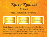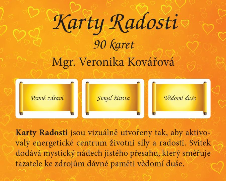Karty Radosti (90ks) jsou vizuálně utvořeny tak, aby aktivovaly energetické centrum životní síly a radosti. Svitek dodává mystický nádech jistého přesahu, který směřuje tazatele ke zdrojům dávné paměti vědomí duše. Sada obsahuje 90 karet, které Vám dodají povzbuzení v každodenním životě. Svým designem mají sílu probouzet radost a naději ve Vašem životě. Můžete je používat jako denní rituál, kdy Vám bude zprostředkováno poselství přímo pro Vaši situaci, či jako doplnění k jiným formám výkladů.