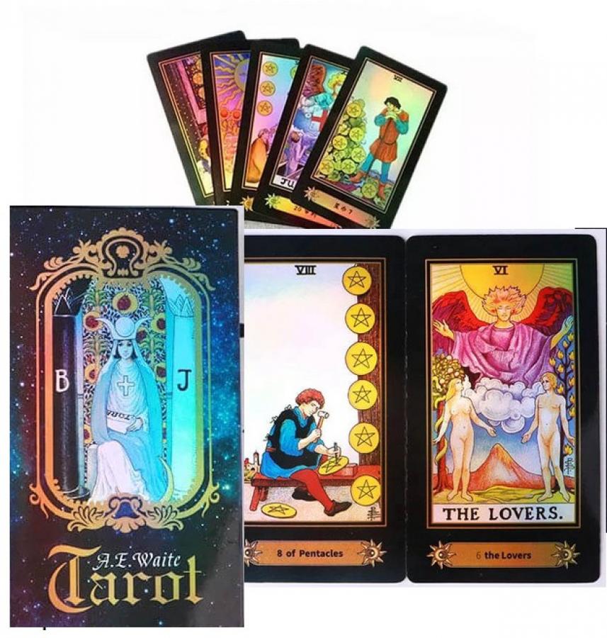 A.E. Waite TAROT (78 karet s duhovým povrchem) mění svou barvu podle úhlu náklonu ke světlu v celém duhovém spektru.