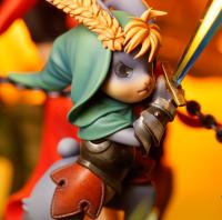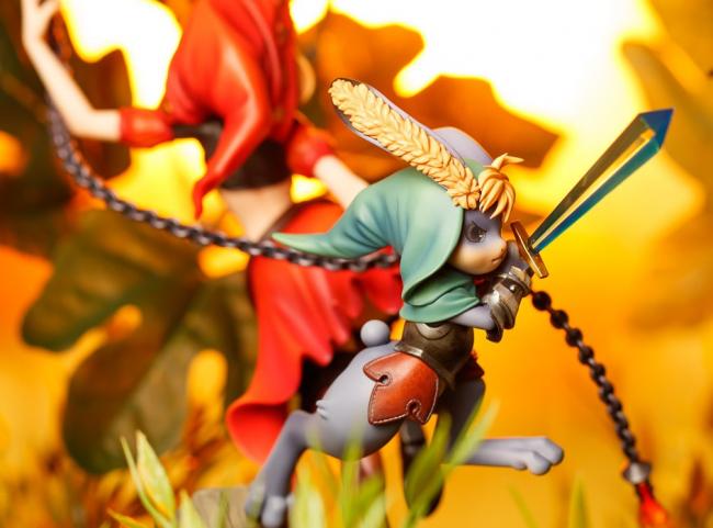 In the game, Velvet has a number of mid to long range attacks owing to her weapon being attached to chains. Cornelius is a more straightforward sword fighter who uses his small size and agility. Their contrasting styles are reflected in this figure, with Velvet s chains forming sweeping arcs while Cornelius is in mid-thrust with his sword.