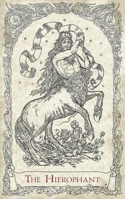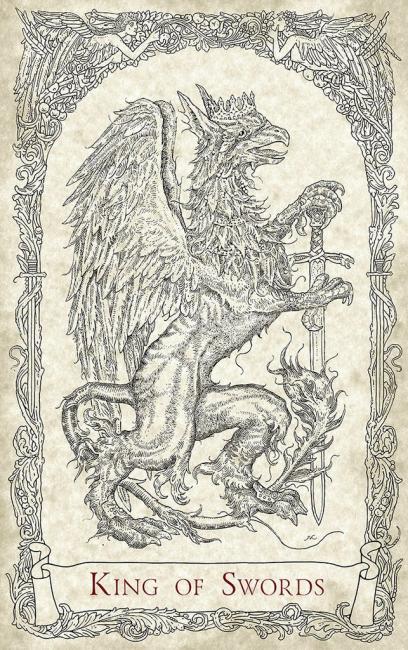Majors and courts each have an illustration of a mythical creatures. Minors ("pips") have highly decorative illustrations and show the suit symbols.
