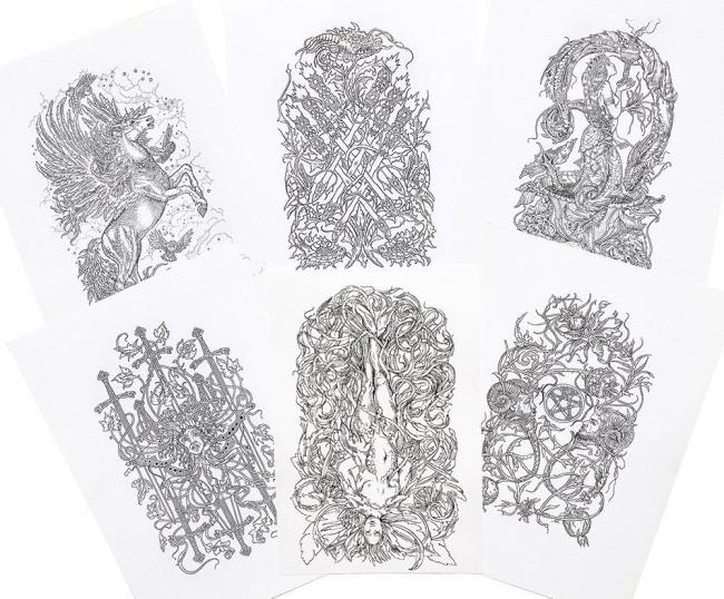 The images are painstakingly drawn in pen and ink by the brilliantly talented Russian artist, Lena Kozachuk, with a great deal of input and image editing by Alex Ukolov. It has been a real partnership, with both enhancing the skills of the other. Karen Mahony designed the concept and structure of the deck.