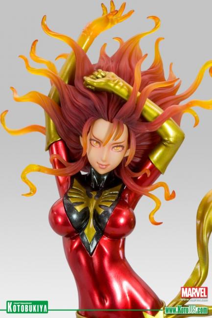 Wearing an alternate costume in brilliant metallic red and gold, the Dark Phoenix looks too hot to handle. Translucent materials used on various body parts and the flame base further add to the perfect likeness and essence of the character, as does the wicked grin on her Bishoujo-styled face.
