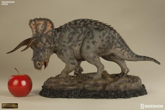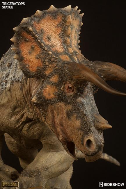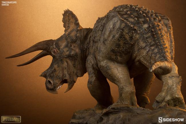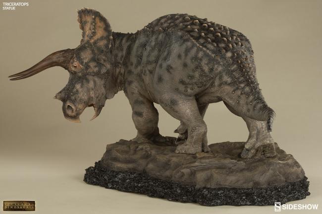 With a name that means "three-horned face", Triceratops is one of the most famous dinosaurs, and one of the last ever to walk the Earth. Thought to have been hunted by the Tyrannosaurus Rex, the massive barrel-ribbed herbivore used its spectacular brow horns and broad curving neck frill to protect itself from predators. Designed with the insight of renowned paleoartists, Sideshow s artists have captured the magnitude and grace of the Triceratops with impressive realism. Cast in polystone on a themed base, this museum quality piece is guaranteed to capture the imagination of dinosaur enthusiasts.