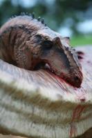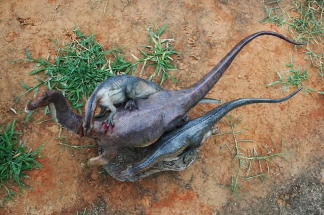 The model s backstory explains that a desperate pack of Allosaurs have successfully ambushed a juvenile Camarasaurus, cutting him off from the herd and throwing everything they’ve got at him. Snapping and clawing viciously at their prey, the massive macronarian is ultimately subdued when one of the females springs upon him, sinking her jaws into his neck. In a classic twist of irony, the sauropod s collapse not only ends his own life, but the life of the female as well. The surviving carnivores are now blessed with two carcasses to gorge themselves on. The scene is like something from a Delgado novel.
