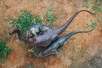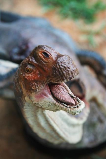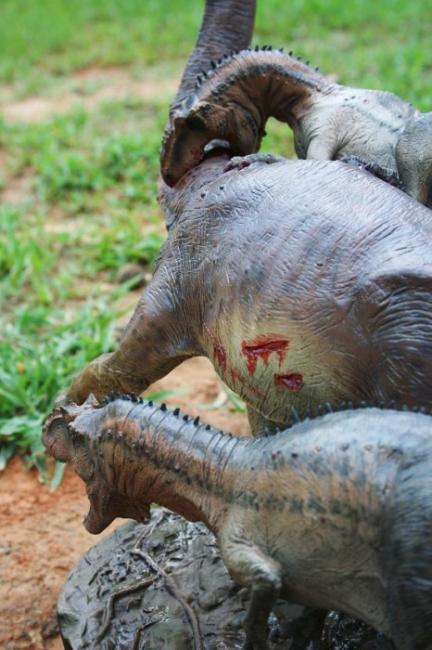The Camarasaurus is colored conservatively in earthen tones – the backstory makes special mention of “faded colors”, which the Allos would seek out to indicate a sick prey item – and this fits the popular notion that large animals would not bear intricate display patterns. The Allosaurs themselves bear more the hue of rotten flesh, decked out in putrid pinks and grisly grays, even crimson eyes to amplify their devilishly dirty nature. For further “doom and gloom” atmosphere, the base imitates a muddy landscape, a bleak stage subject to heavy rainfall. There is also glistening mud on the legs of the Camarasaurus, a simple touch that the onlooker would particularly like, because it reinforces the idea of an animal existing as part of its environment.