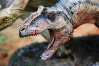 In one of the most famous sets of fossilized dinosaur tracks ever discovered, there is exciting evidence of an Acrocanthosaurus actually leaping and briefly clinging onto a sauropod. With this in mind, it seems reasonable that the relatively agile Allosaurus could be capable of such a feat. This makes for a thrilling finish to the fight, with every animal in motion, muscles straining, jaws gaping, in that typical over-the-top fashion that Sideshow Dinosauria statues are known for. Packs of Allosaurs would probably rely on exhausting a sauropod from blood loss in order to take it down. This traditional “hit and run” attack method is evident in the gushing wounds on the herbivore s flank, as well as the fresh blood lining the jaws and claws of the running hunter.