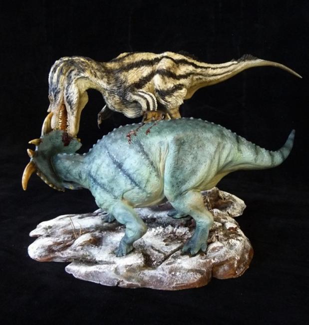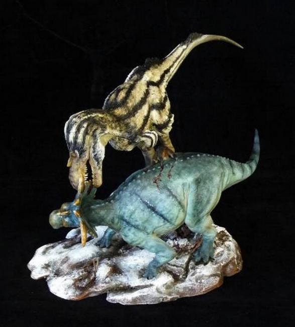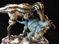Following the great success of the Diabloceratops, here comes the second project with Sean Cooper in sketching a violent encounter with Gorgosaurus and Pachyrhinosaurus. This epic encounter provides a fresh twist on the classic theropod versus ceratopsian fight, with gorgeously reconstructed animals based on the latest science. Final paint work was implemented by Martin Garratt. The feathery coat on the carnivore was designed with the striking patterns of the black and white warbler, while the herbivore s paint design was inspired by the Cayman Island blue iguana. Multiple fresh wounds can be found in the scene, which takes place on a perilously slick and snow dusted Cretaceous battleground.