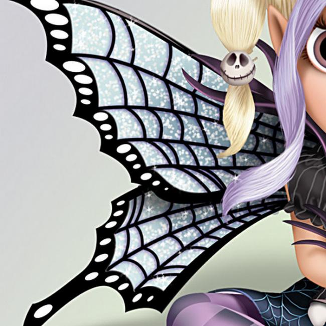 From her signature big bright eyes, colorfully streaked hair and striped stockings, to her skeletal hair accessories and spider-web wings, she is frightfully delightful. And, of course, she holds her very own Jack Skellington, complete with pinstriped suit and ghoulish grin.