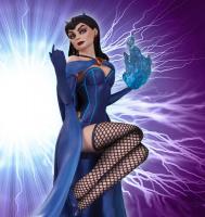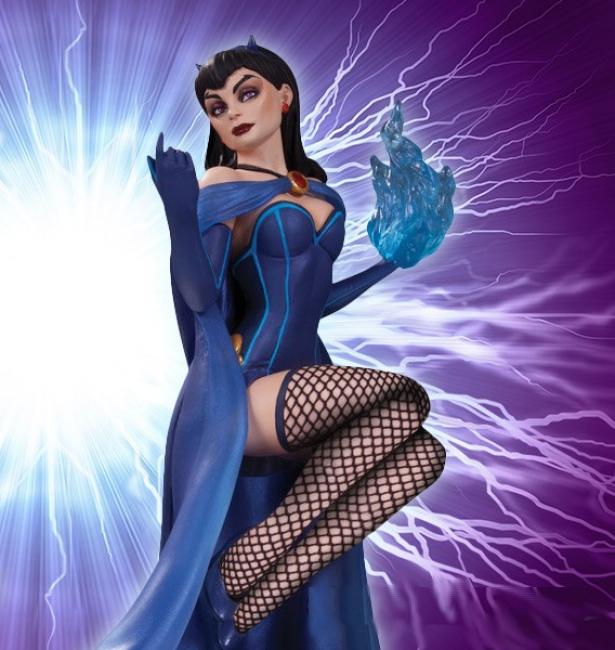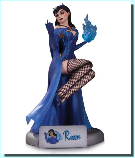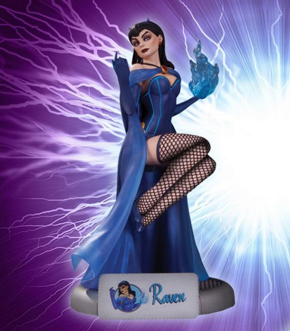 Standing 27 cm/ 8 1/2-inches tall, she levitates over her base with her cape acting as a stand. Made of highly detailed poly-resin, she will be a perfect addition to any pinup collection. Raven features her hovering atop her base, as her cape acts as a stand. Raven is decked out in her blue outfit along with fishnet stockings, and is displaying her magical powers.