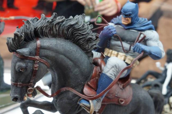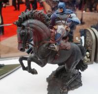 Mounted on a horse as black as the night he defends, the Caped Crusader rallies the troops!