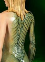 Based on movie poster key art, Sil is depicted mid transformation between her sensuous human form and armor plated Alien killer. The Alien creature was designed by HR Giger and portrayed in human guise by Natasha Henstridge.