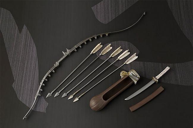 Set includes interchangeable hands (x6), bow and arrow set, katana set, and quiver.