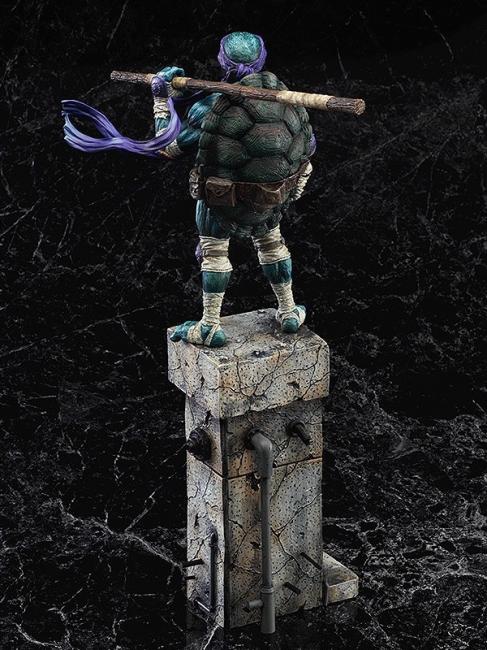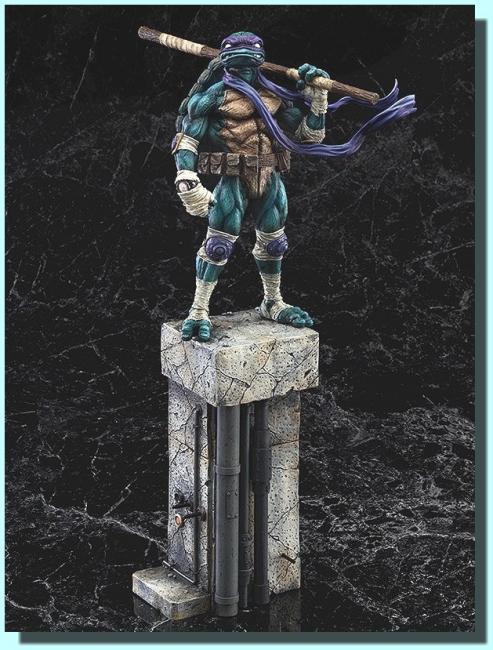 Donatello stands 10 1/2-inches tall on a crumbling ledge base.